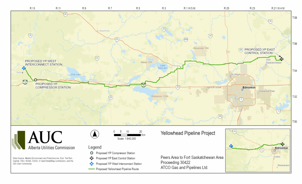 ATCO Gas and Pipelines Ltd. (ATCO) filed an application with the Commission on November 4, 2025, requesting approval for the construction and operation of a new pipeline called the Yellowhead Pipeline Project. The project consists of installing approximately 235 kilometres of new 914-millimeter pipeline from the Peers, Alberta area into the Fort Saskatchewan area. The project also consists of installing a new control station and compressor station along the route. The AUC issued a notice of application on November 19, 2025.